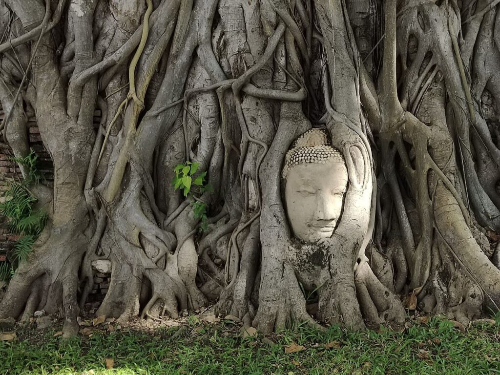 A Buddha statue buried on the roots of a Banyan tree